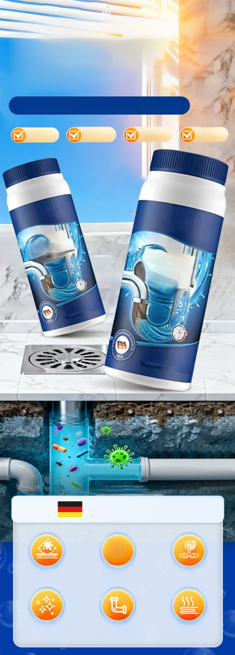 แก้ปัญหาท่อตันได้ภายใน 1 วินาที! 🔥ไม่ต้องพึ่งช่างประปา! ประหยัดค่าใช้จ่ายในการแก้ปัญหาท่อตันได้หลายหมื่นบาทต่อปี น้ำยาทำความสะอาดท่อนี้ช่วยสลายคราบไขมันที่สะสมในท่อระบายน้ำในครัว แก้ปัญหาท่อตันในห้องน้ำ/โถสุขภัณฑ์/พื้น ลดกลิ่นไม่พึงประสงค์ และไล่แมลงขนาดเล็ก ไม่ทำลายท่อและไม่เป็นอันตรายต่อมนุษย์